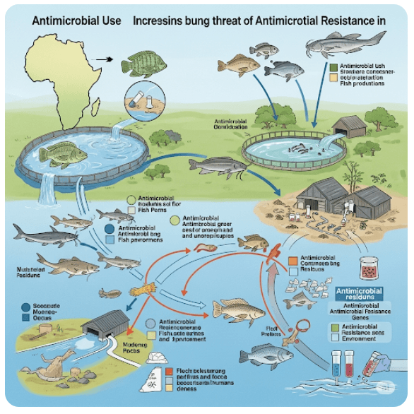 In low- and middle-income countries, data on antimicrobial use (AMU) and antimicrobial resistance (AMR) in aquaculture are scarce. Therefore, summarizing documented data on AMU, antimicrobial residue (AR), and AMR in aquaculture in Africa is key to understanding the risk to public health. Google Scholar, PubMed, African Journals online, and Medline were searched for articles published in English